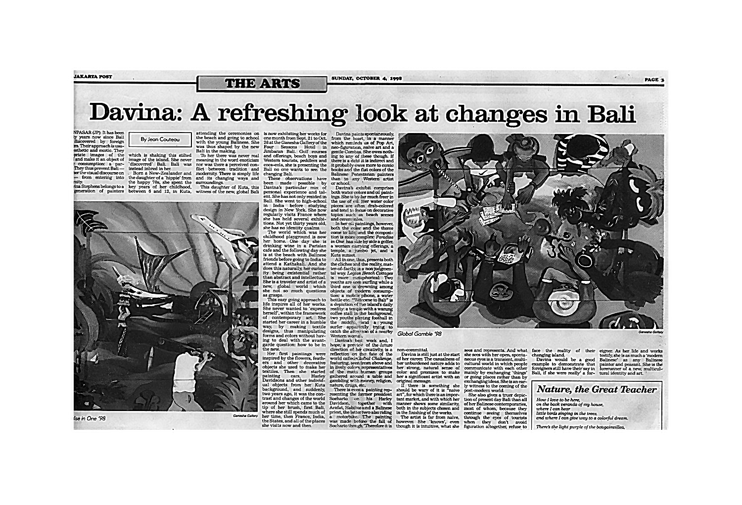 Welcome to Bali is the island’s daily reality: a temple with a warung coffee stall in the background, two youths playing football in the middle, and a young surfer apparently trying to catch the attention of a nearby Western woman. Davina’s best work, and I hope a preview of the future direction of her creativity, is a reflection on the fate of the world: Global Gamble. Featuring scenes from above and in lively colors, representatives of the main human groups are gathered around a table and gambling with money, religion, nature, drugs, etc. There is even a painting representing former president Soeharto on his Harley Davidson together with Arafat, Habibie, and a Balinese priest, the latter too riding a motorbike. The painting was made before the fall of Soeharto though. Therefore it is non-committal. Davina is still just at the start of her career. The casualness of her unburdened nature adds to her strong, natural sense of color and promises to make her a significant artist with an original message. If there is something she should be wary of, it is “naïve art,” for there is an important market in it, and with which her manager shows some similarity both in the subjects chosen and in the finish of the works.
