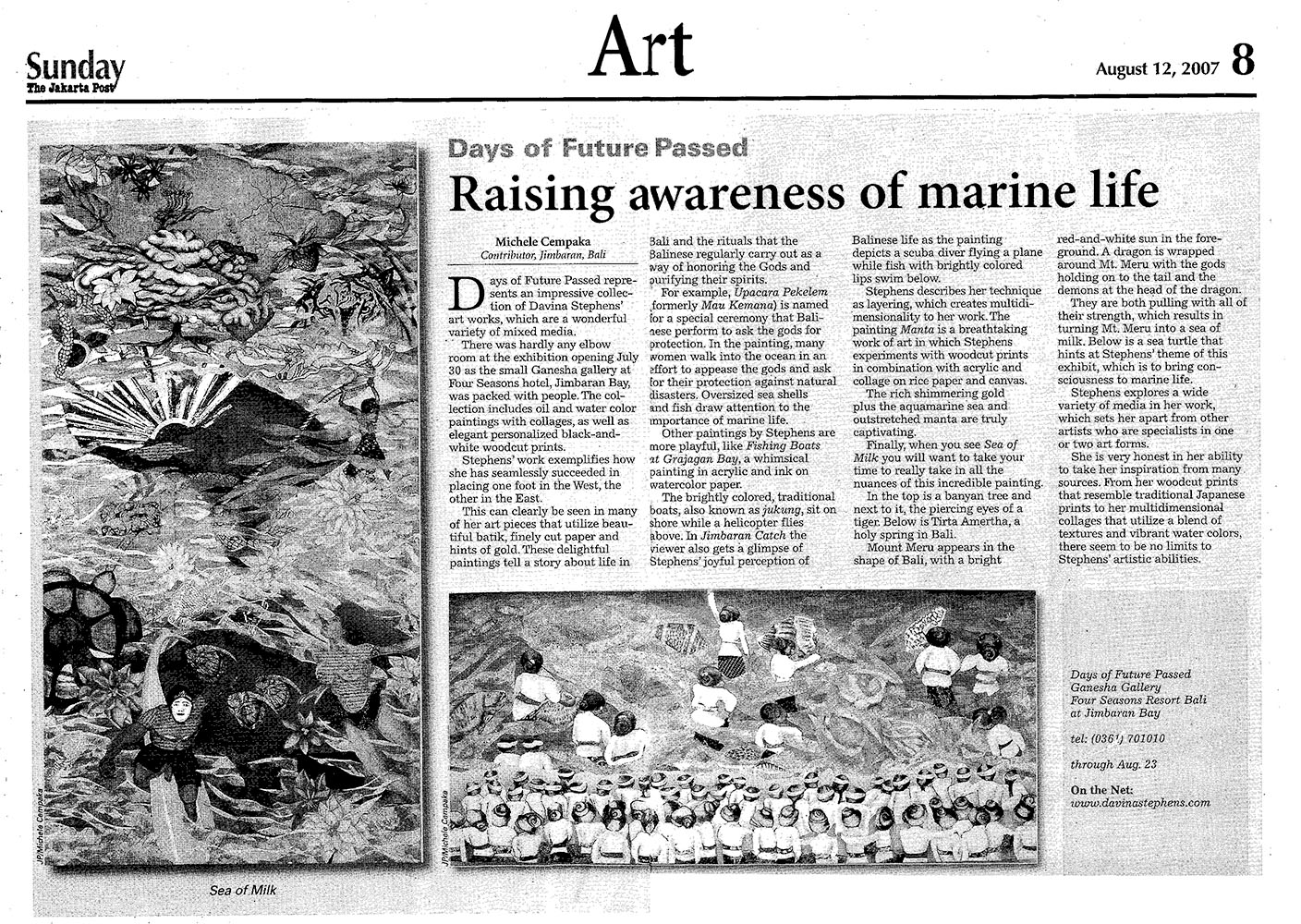For example, “Upacara Pekelem” (formerly Mau Kemana) is named for a special ceremony that Balinese perform to ask the gods for protection. In the painting, many women walk into the ocean in an effort to appease the gods and ask for their protection against natural disasters. Oversized sea shells Balinese life as the painting depicts a scuba diver flying a plane while fish with brightly colored lips swim below Stephens describes her technique as layering, which creates multidimensionality to her work. The painting “Manta” is a breathtaking work of art in which Stephens experiments with woodcut prints in combination with acrylic and collage on rice paper and canvas. The rich shimmering gold red-and-white sun in the fore-ground. A dragon is wrapped around Mt Meru with the gods holding on to the tail and the demons at the head of the dragon. They are both pulling with all of their strength, which results in turning Mt. Meru into a sea of milk. Below is a sea turtle that hints at Stephens’ theme of this exhibit, which is to bring consciousness to marine life. Stephens explores a wide and fish draw attention to the importance of marine life. Other paintings by Stephens are more playful, like Fishing Boats at Grajagan Bay, a whimsical painting in acrylic and ink on watercolor paper. The brightly colored, traditional boats, also known as jukung, sit on shore while a helicopter files above. In Jimbaran Catch the viewer also gets à glimpse of Stephens’ joyful perception of plus the aquamarine sea and outstretched manta are truly captivating.