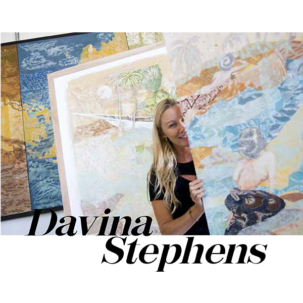 Bali is often thought to be a paradise destination—a place where the soft sway of palm trees, sun-drenched beaches and a rich, vibrant culture have inspired the curiosity of travelers from all corners of the world. From batik prints to teak woodcut sculptures, Balinese arts and crafts have long been popular beyond the reaches of this small tropical island. Artist Davina Stephens has devoted the past 30 years to capturing what truly makes her homeland unique. Although she left Bali as a teenager for India and Australia, she always knew that she would return. Davina often reflects back on a time before the tourist buses clogged the streets and mega resorts invaded the coastline; a time a time when, as a young girl, she would bike down the dirt roads she would bike down the dirt roads and dodge falling coconuts with her Balinese classmates. In her art, she juxtaposes iconic Balinese symbols of sea, sand and surf and mythical underwater creatures with images of Hindu gods, temples and mundane modern items. Davina’s style has transformed over the years, too, from surrealist and dreamy compositions awash with soft pastels, to monochromatic erotic nudes, stark woodcuts and multi-layered mixed media canvases. Her work has been exhibited in Bali, across Asia and has reached as far as France and Australia. With each exhibition abroad, Davina transmits her vision of Bali—a land of mythical beauty and where she is proud to call her home.